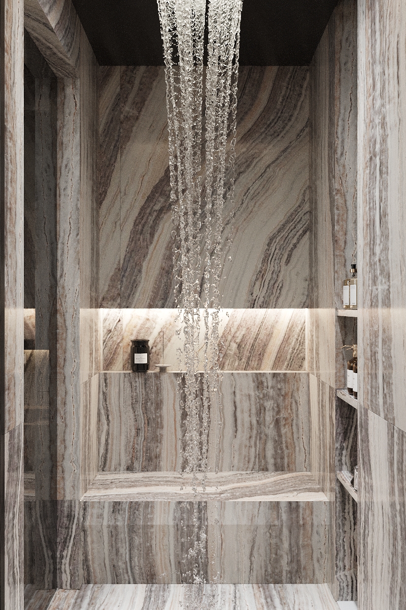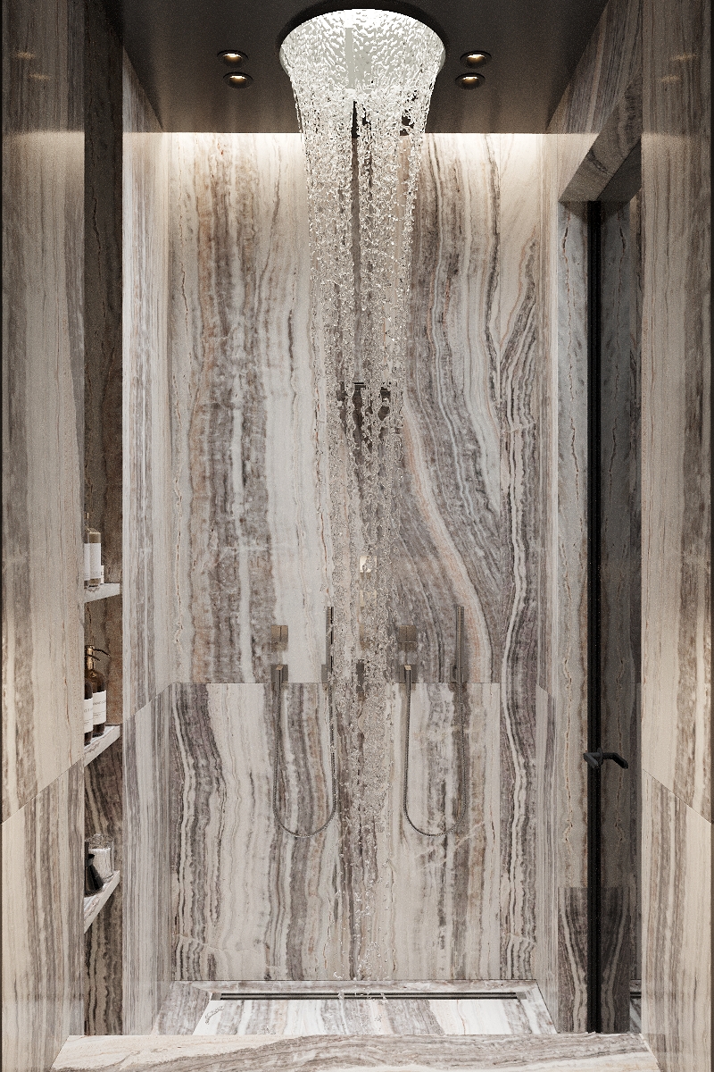Центральным элементом хамама является каскадный душ, встроенный в потолок. Вода, струящаяся подобно водопаду, обеспечивает полное расслабление и создает уникальную атмосферу. Подсветка, интегрированная в ниши стены, подчеркивает текстуру мрамора и добавляет мягкий свет, способствующий расслаблению. Полки, также встроенные в стены, предназначены для хранения банных принадлежностей и аксессуаров, что обеспечивает порядок и удобство использования.
