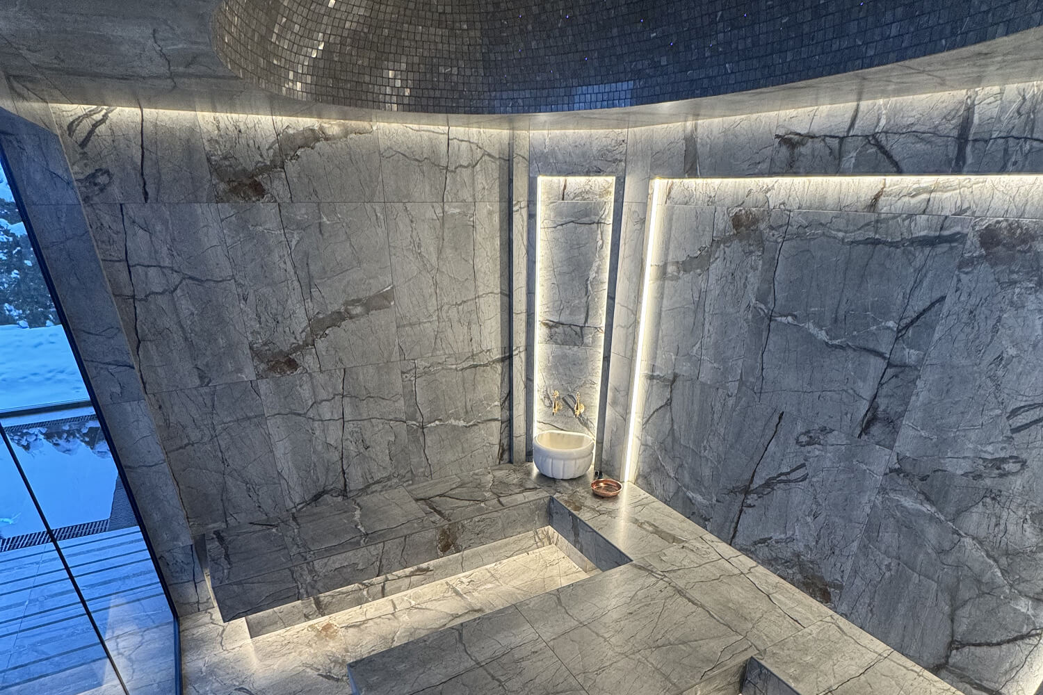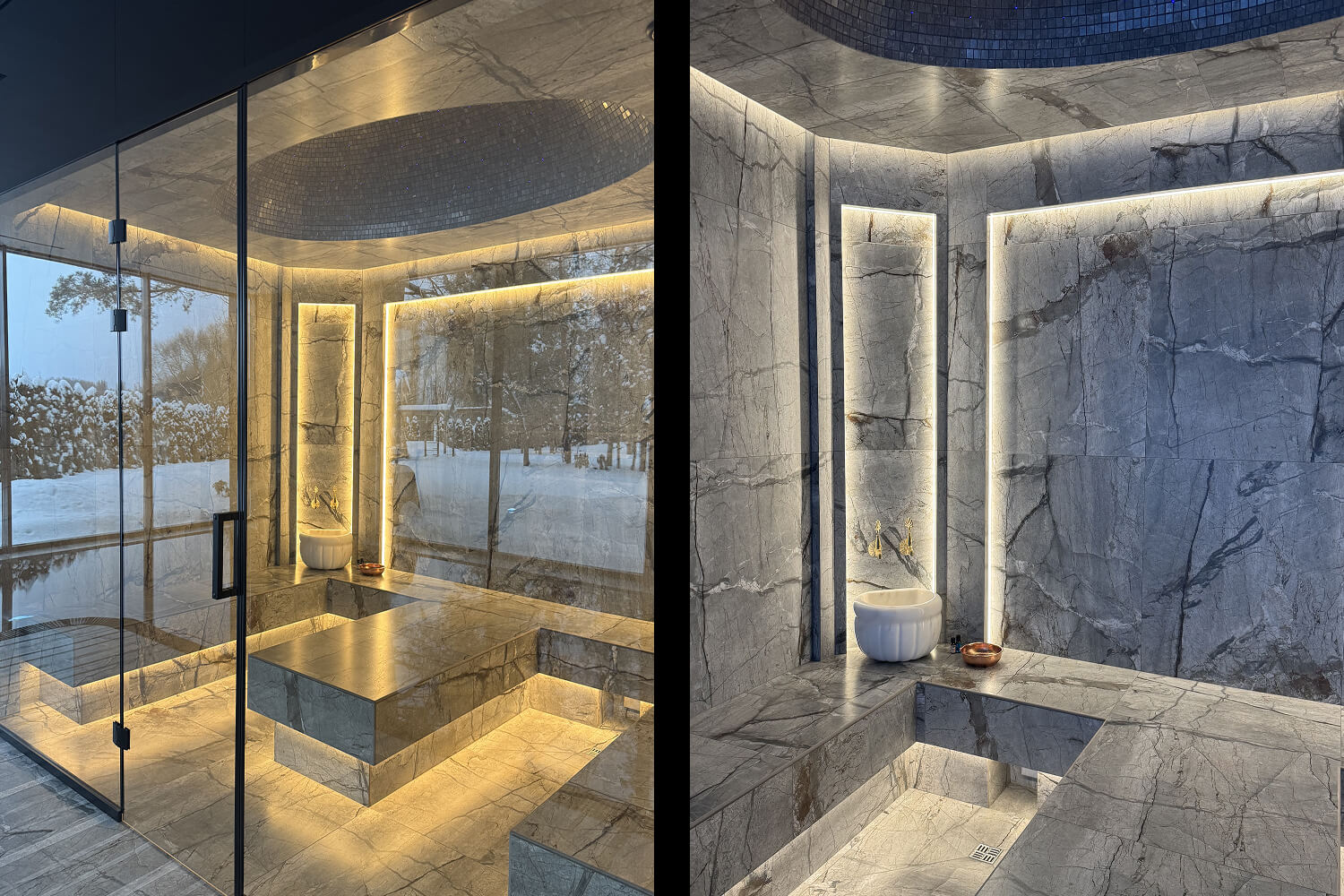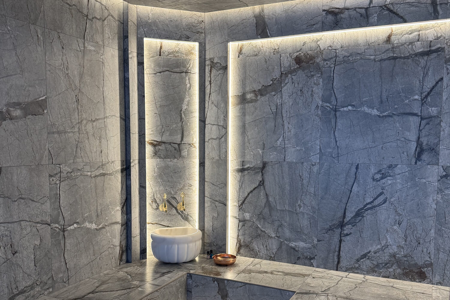 Качественная хаммам отделка выполнена с акцентом на натуральный камень и световые сценарии, создающие ощущение тепла и уединения: