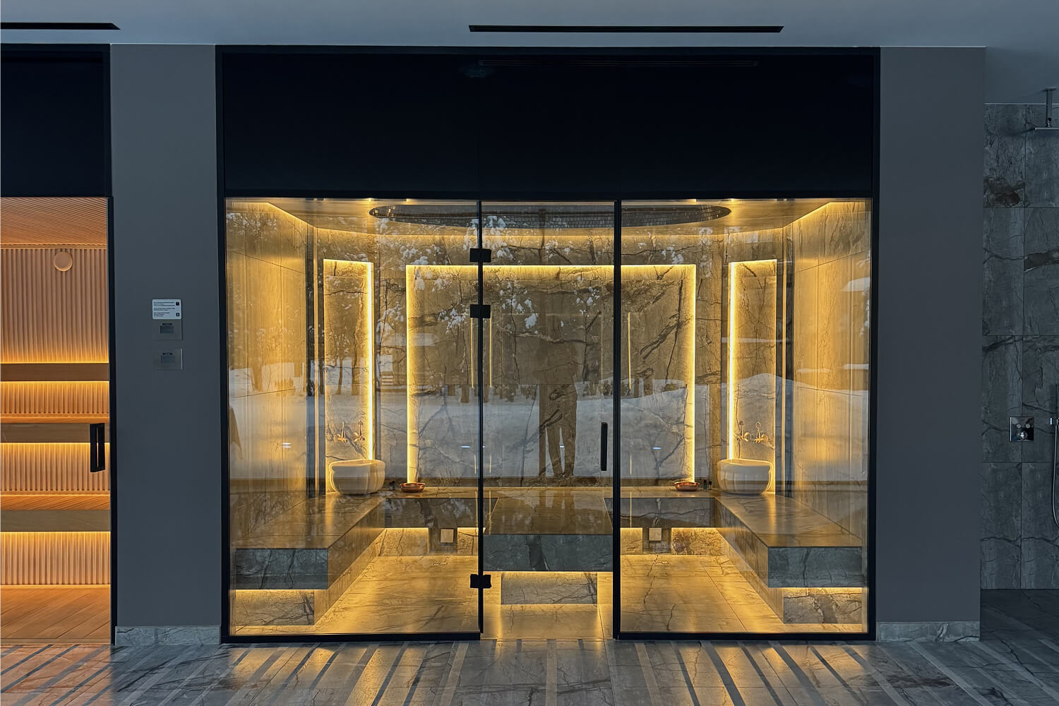 Купольная форма усиливает акустику и циркуляцию пара, а деликатная подсветка подчёркивает текстуру натуральных материалов.