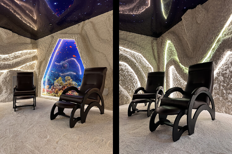 Соляная комната в санатории «Приморский» — это современный галокомплекс для камерной галотерапии, созданный для релаксации и оздоровления гостей. Интерьер выполнен в морской тематике, где сочетаются декоративные элементы, мягкое освещение и натуральная соляная отделка.
