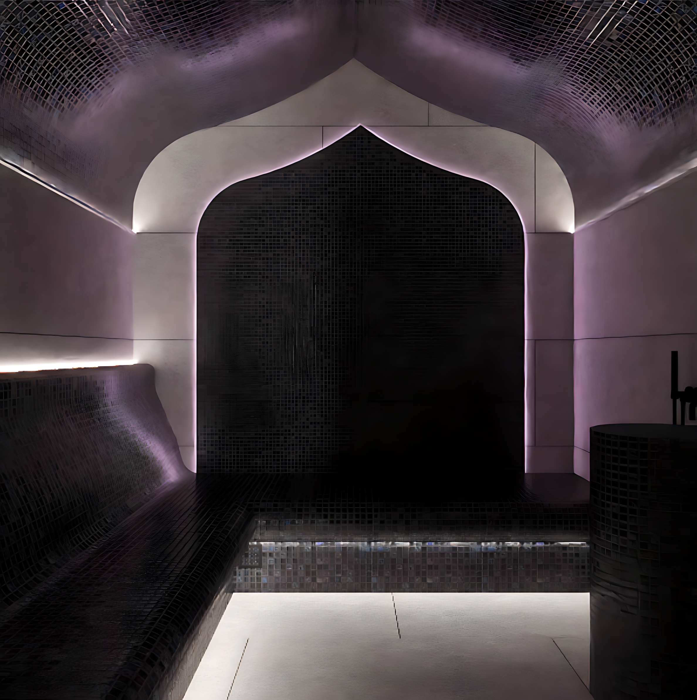 Главная особенность хамама — изысканная арка, выложенная мелкой мозаикой, которая создает эффект уюта и уединения. Подсветка, скрытая в нишах, мягко освещает помещение, подчеркивая архитектурные элементы и создавая приглушенную, успокаивающую атмосферу.