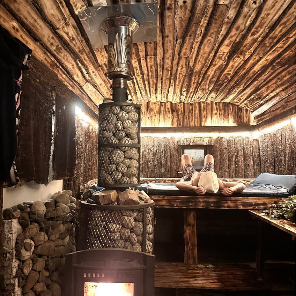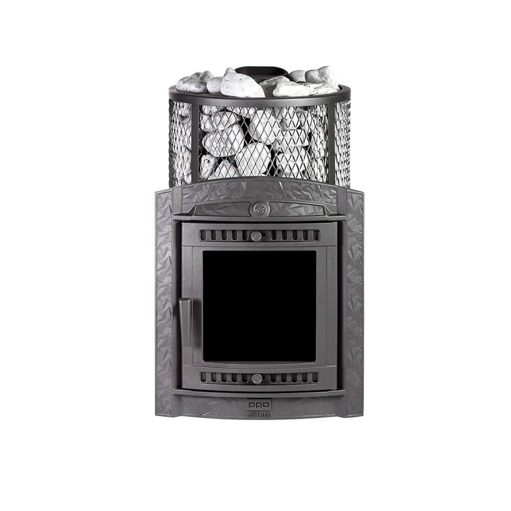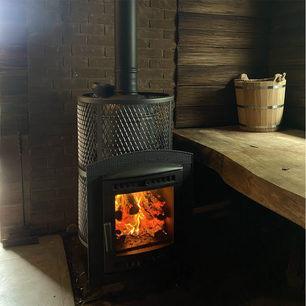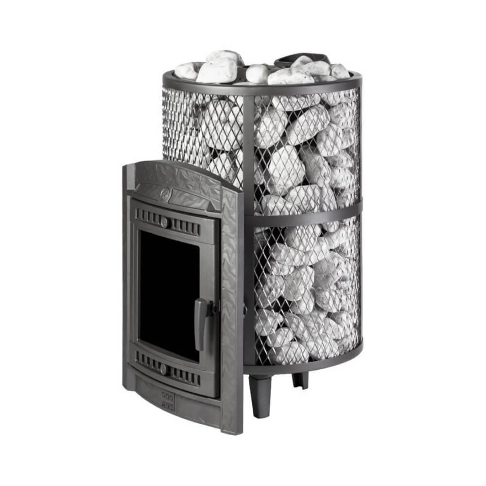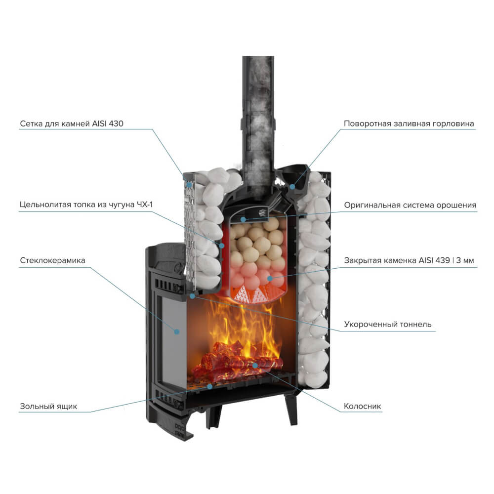 Печь оснащена комбинированной каменкой: внутренняя закрытая каменка из нержавеющей стали формирует легкий мелкодисперсный пар, а внешняя сетка аккумулирует тепло и усиливает прогрев помещения. Общая масса камней достигает до 180 кг, что обеспечивает стабильную работу даже при интенсивной эксплуатации.