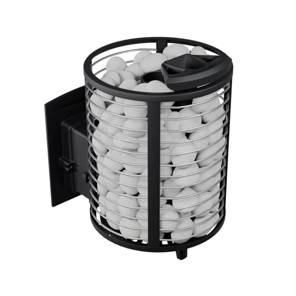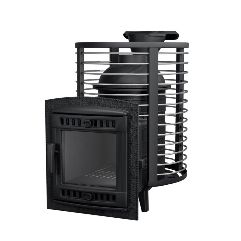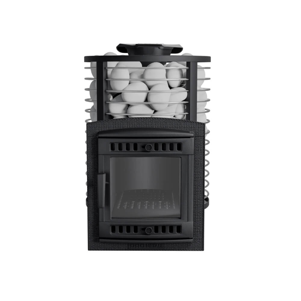 Модель оснащена комбинированной каменкой: внутренняя закрытая каменка отвечает за образование легкого, мелкодисперсного пара, а внешняя сетка аккумулирует тепло. Общая масса камней достигает 130–150 кг, что позволяет долго сохранять температуру. Это делает печь отличным выбором как печь для русской бани с закрытой каменкой, так и универсальной печью для сауны и хаммама.