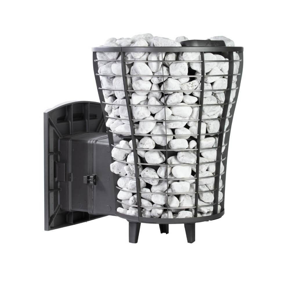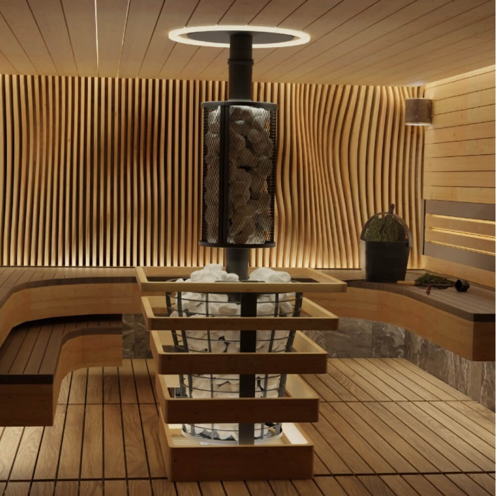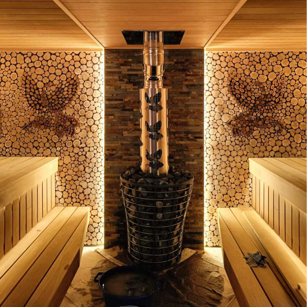 Печь оснащена стильной дверцей с жаропрочным стеклом, создающей эффект камина. Это делает её не только функциональной, но и эстетически привлекательной — отличное решение для проектов отделки бань и саун премиум-класса.