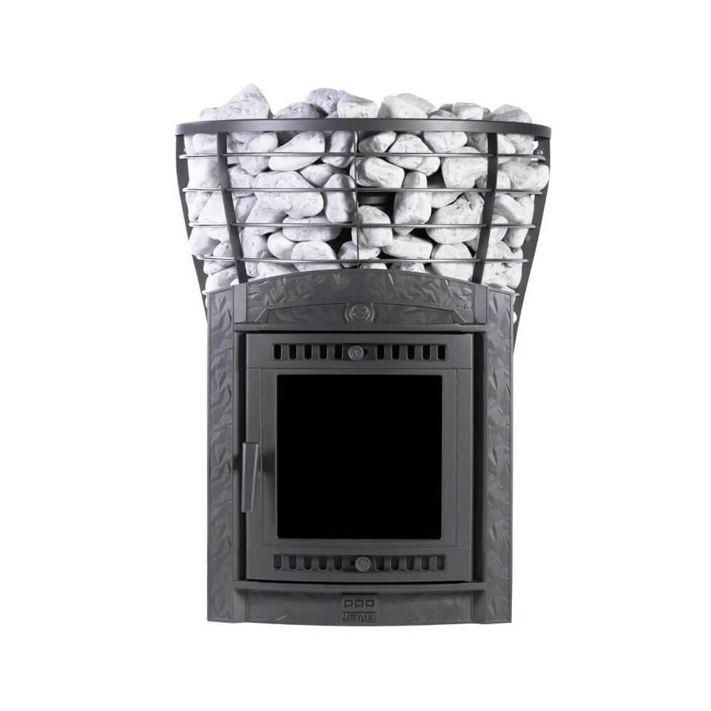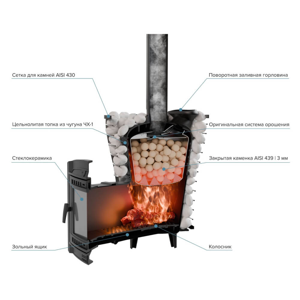 Объем загрузки камней достигает 280–300 кг, благодаря чему формируется насыщенный, легкий пар и стабильное тепло. Модель оснащена комбинированной каменкой: внутренняя закрытая каменка отвечает за мелкодисперсный пар, а внешняя сетка аккумулирует тепло. Это делает печь универсальной — как печь для русской бани с закрытой каменкой, так и эффективная печь для сауны и хаммама.