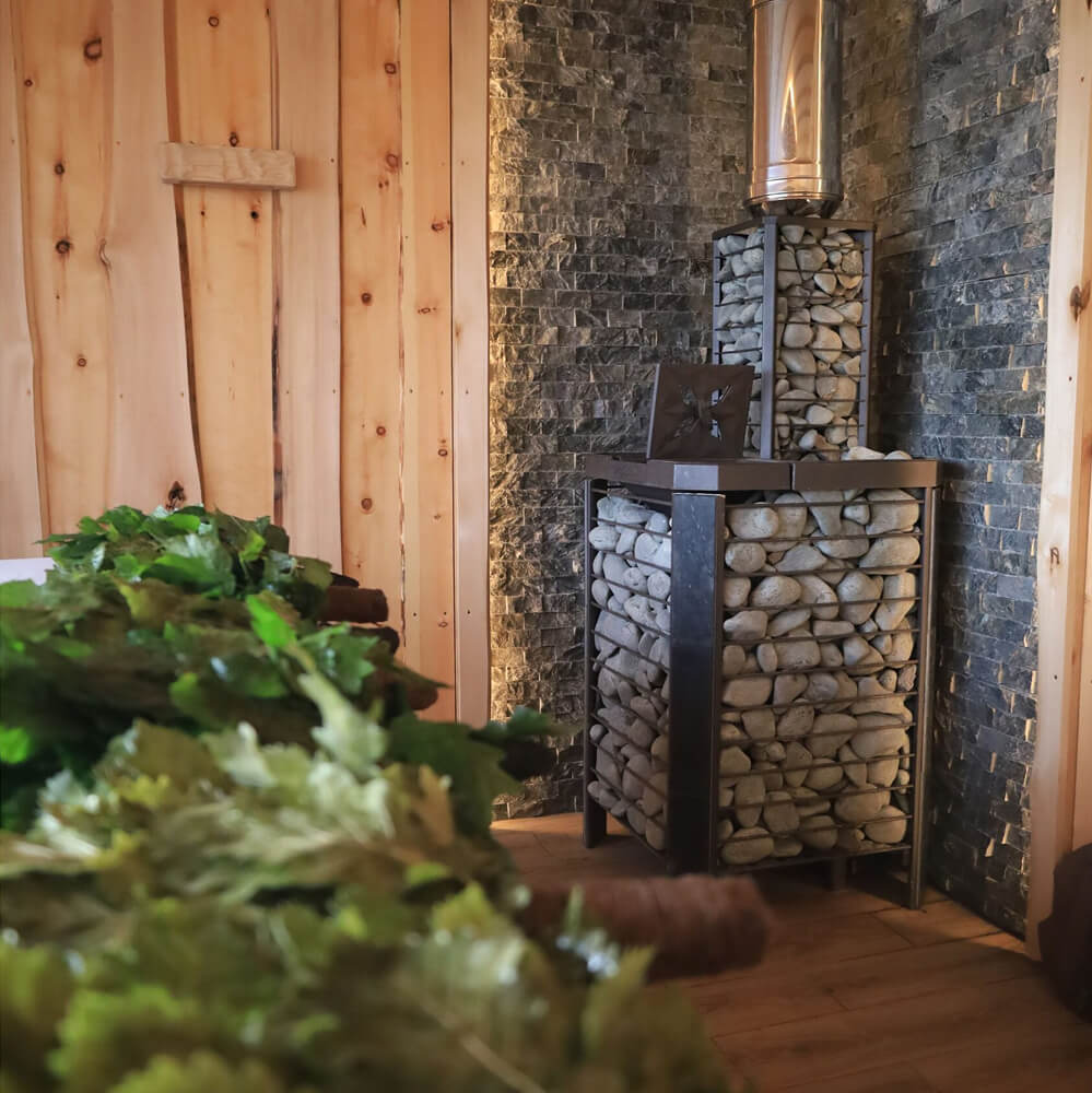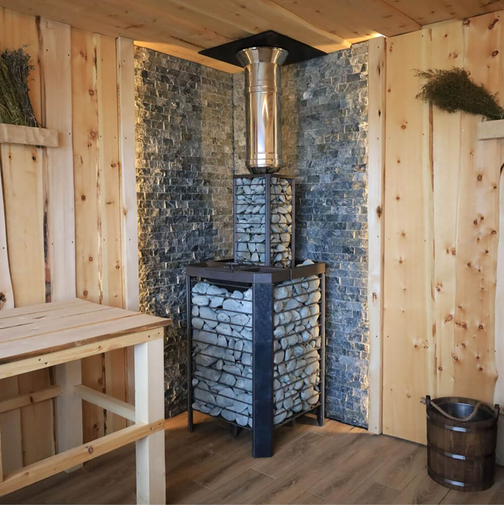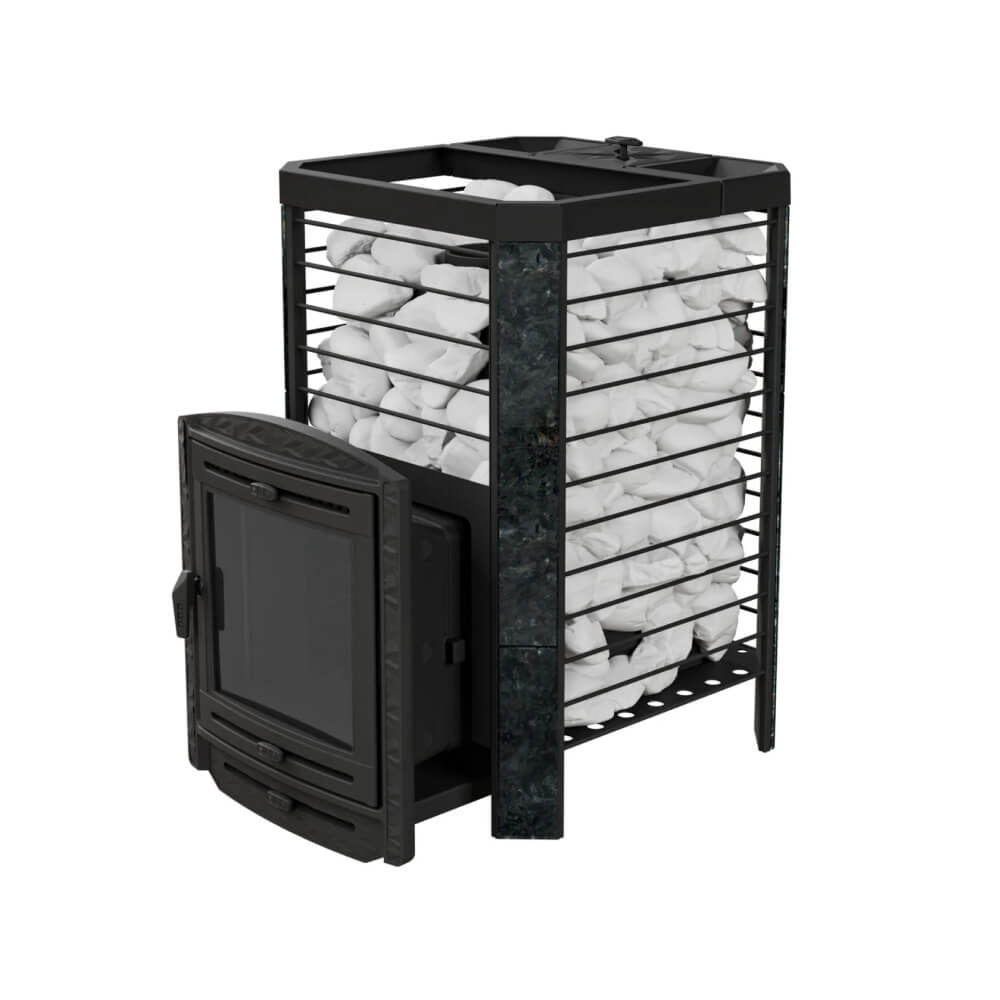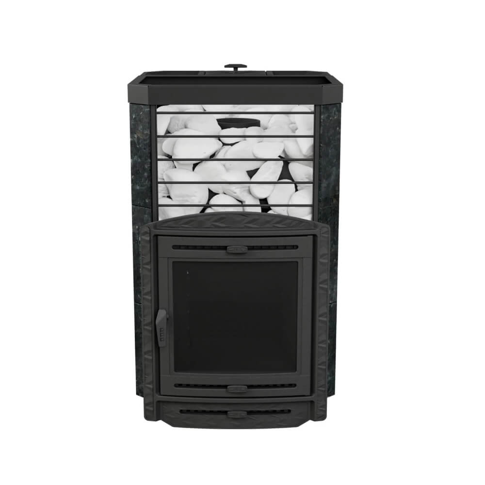 Современная конструкция печи выполнена в формате сетки для камней, что позволяет загрузить до 300–330 кг камня. Это обеспечивает равномерный прогрев парной, мягкое тепло и длительное удержание температуры. Такая печь для русской бани с закрытой каменкой формирует легкий, мелкодисперсный пар, который ценится любителями классического парения.