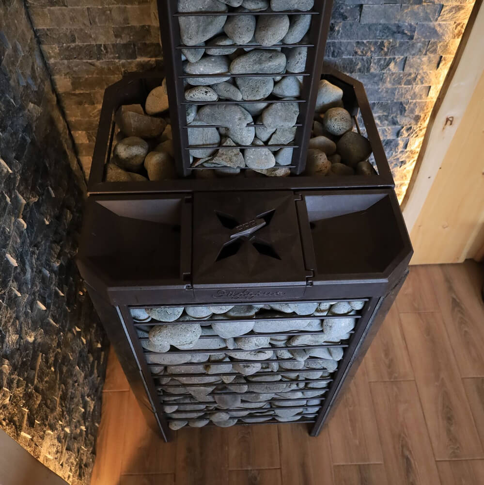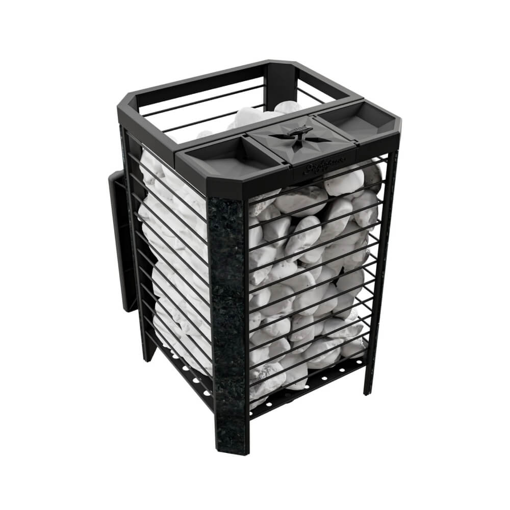 Ключевое преимущество модели — комбинированная каменка: внутренняя закрытая зона отвечает за качественный пар, а внешняя сетка аккумулирует тепло. Это делает «Эйфорию 45» универсальной — она подходит как печь для сауны, так и как печь для русской бани под ключ.