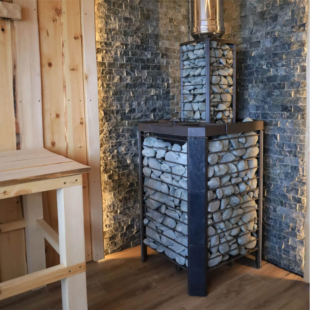 Печь оснащена стильной дверцей с жаропрочным стеклом, создающей эффект камина. Это не только функциональное оборудование, но и важный элемент дизайна — отличный выбор для проектов отделки бань и саун премиум-класса.